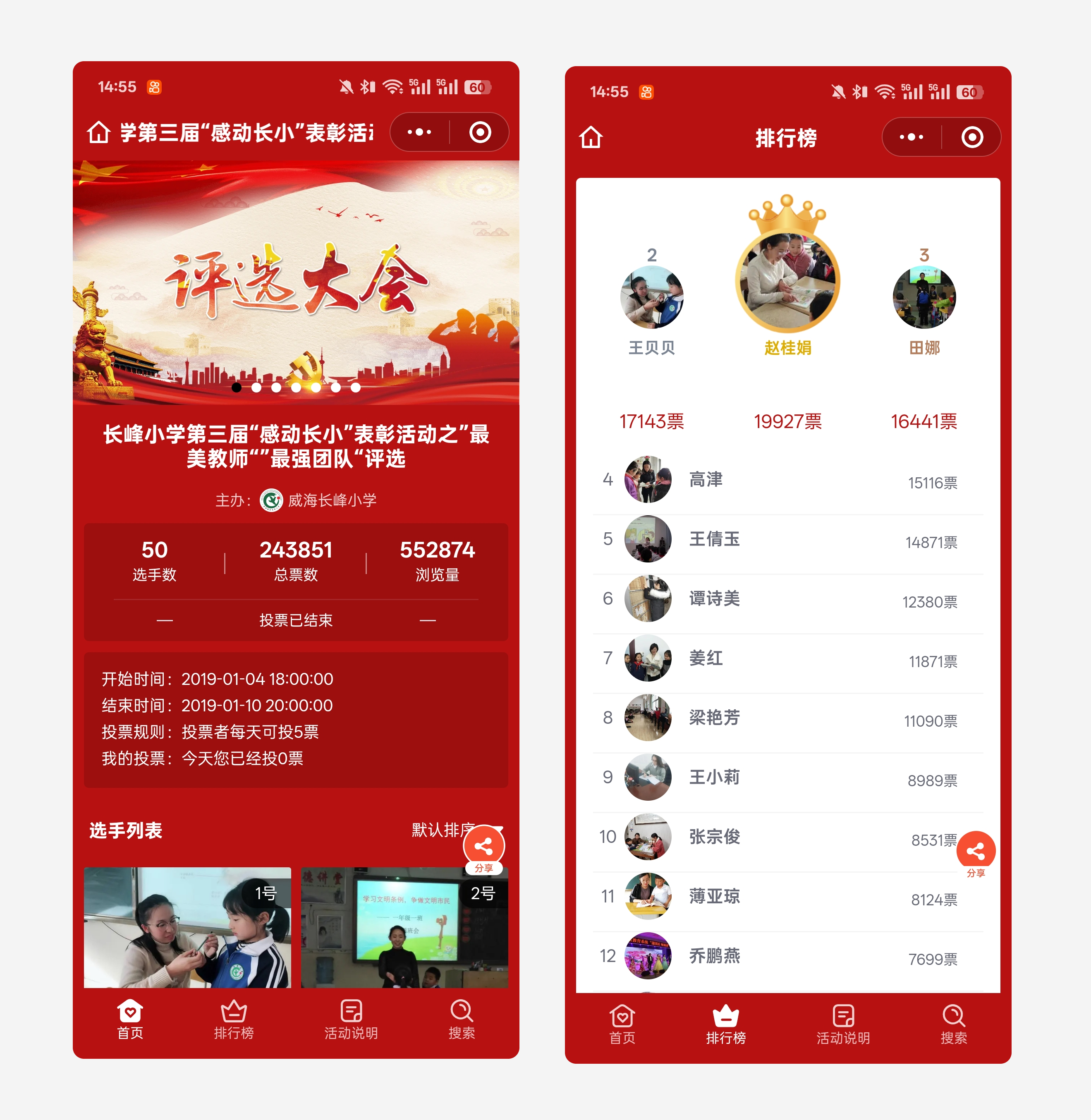 案例三:长峰小学第三届“感动长小”表彰活动之”最美教师“”最强团队“评选,活动由威海长峰小学举办,活动举办期间,总票数达到了24万,浏览量达到了55万。
