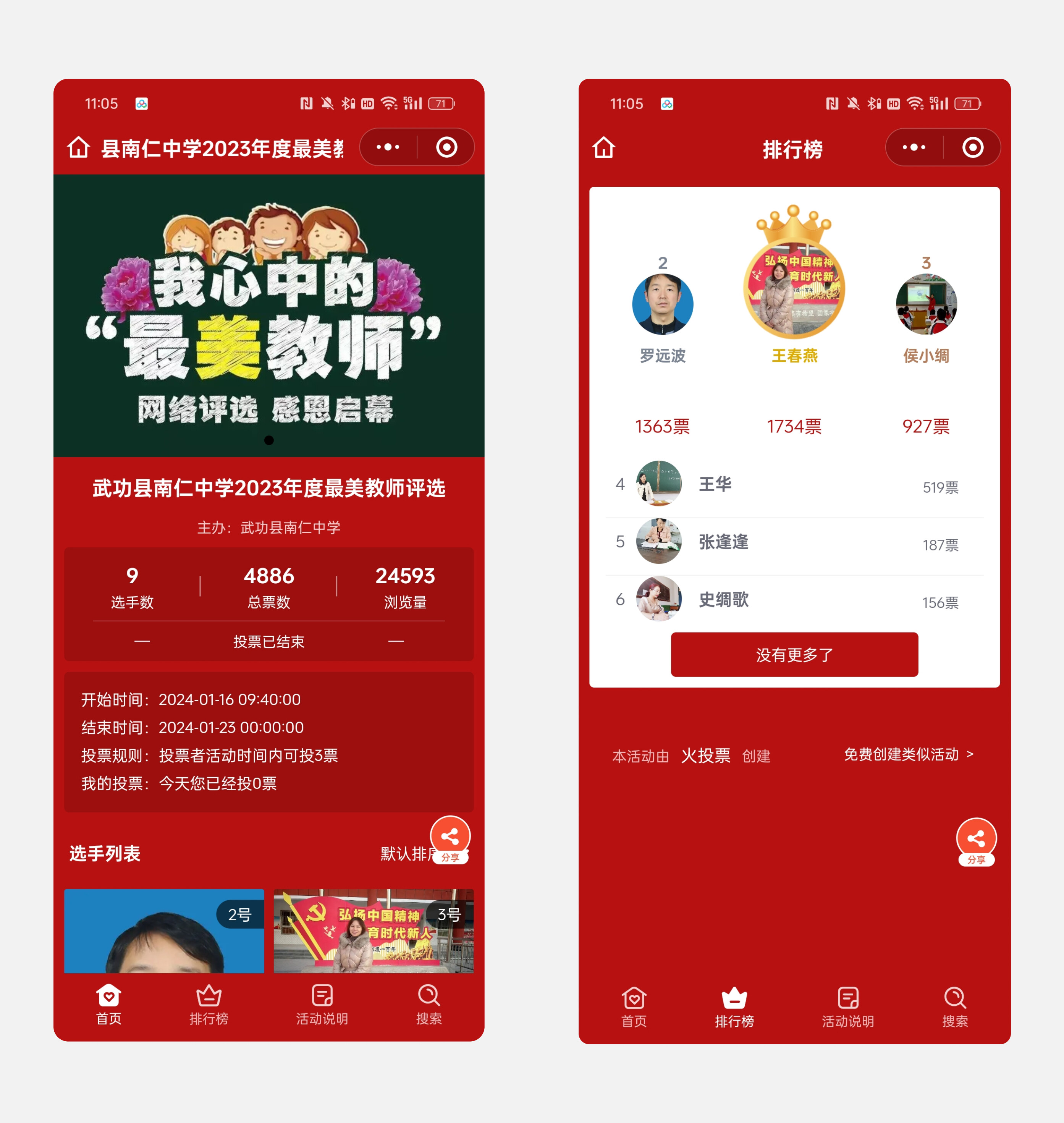 案例二:武功县南仁中学2023年度最美教师评选,活动由武功县南仁中学举办,活动举办期间,总票数达到了4000,浏览量达到了2.4万。
