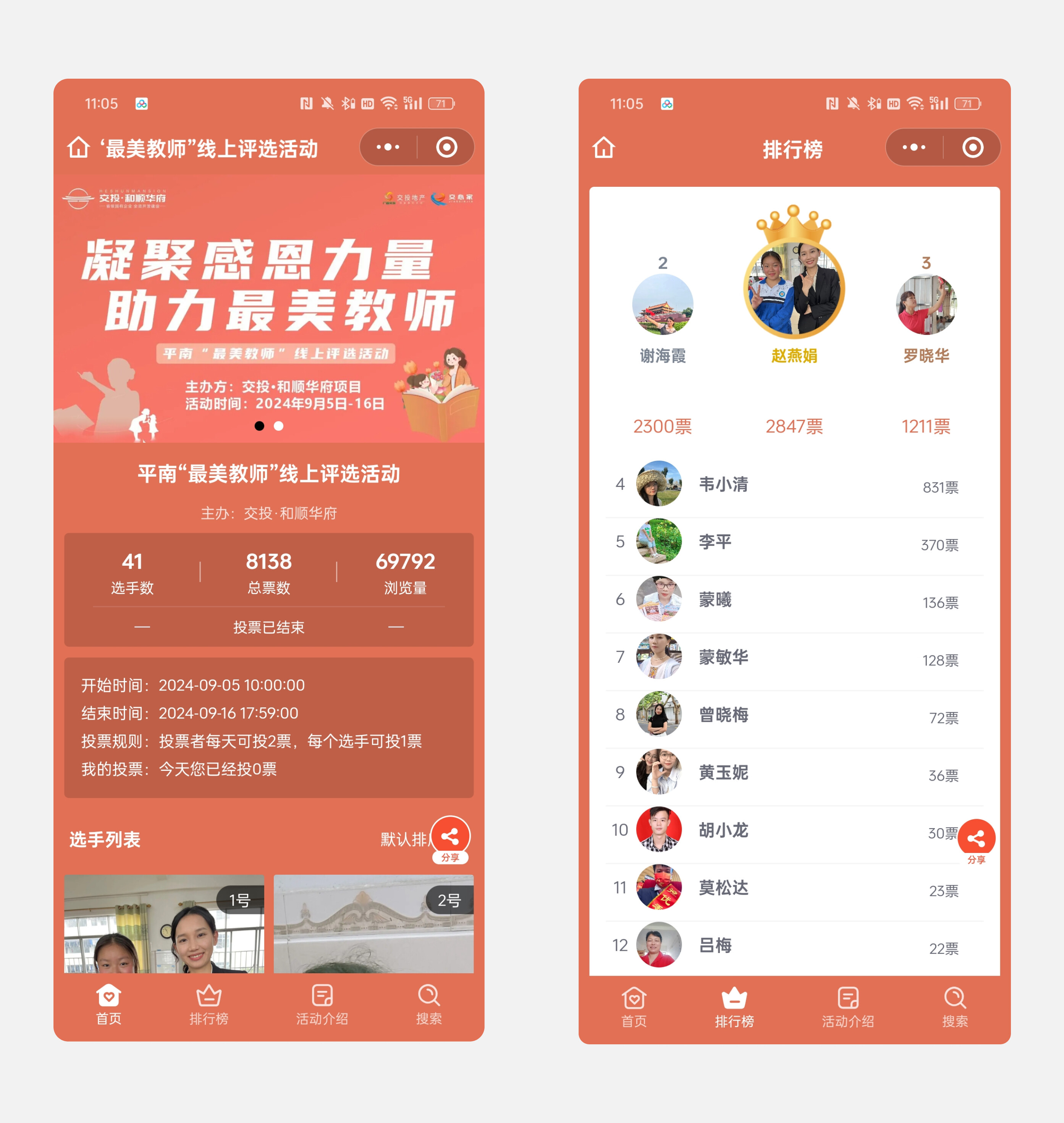 案例一:平南“最美教师”线上评选活动,活动由交投·和顺华府举办,活动举办期间,总票数达到了8000,浏览量达到了6.9万。